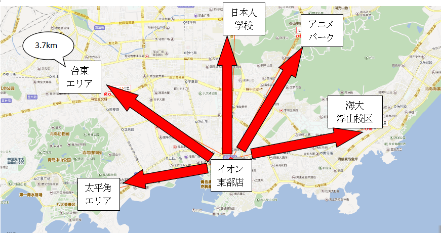 どちらもおよそ距離3.5kmという結果が出た。ピンと来ないので、青島市内にその距離を当てはめてみた。